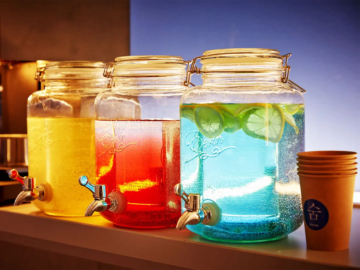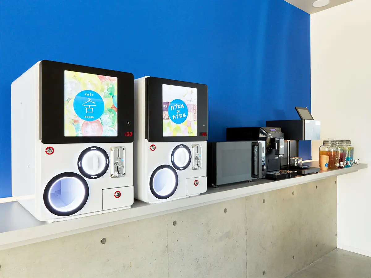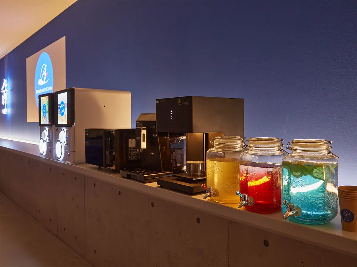 サービスとしてフリードリンクやカプセルトイ、フードプリンター(有料)を設置しております。また、飲食持ち込み(アルコール類除く)もOK!宿泊ご利用の方は無料にてご利用いただけます。