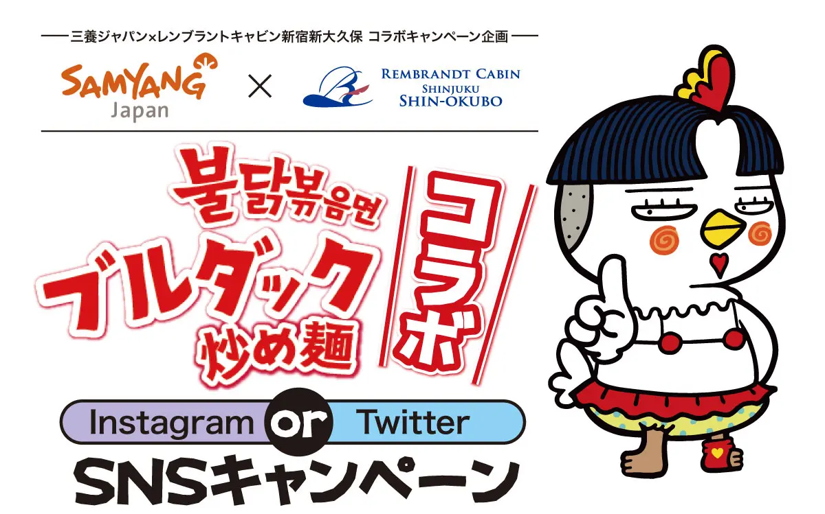 また、リニューアルオープンを記念して、50年以上の歴史と技術力でグローバルブランドとして成長した「ブルダック炒め麺」を通してK-FOODの人気を牽引してきた株式会社三養ジャパン(所在地:東京都新宿区、代表取締役:高 海正)とコラボしたSNSキャンペーン「#ブルダック_レンブラントキャビンコラボキャンペーン」を実施いたします。