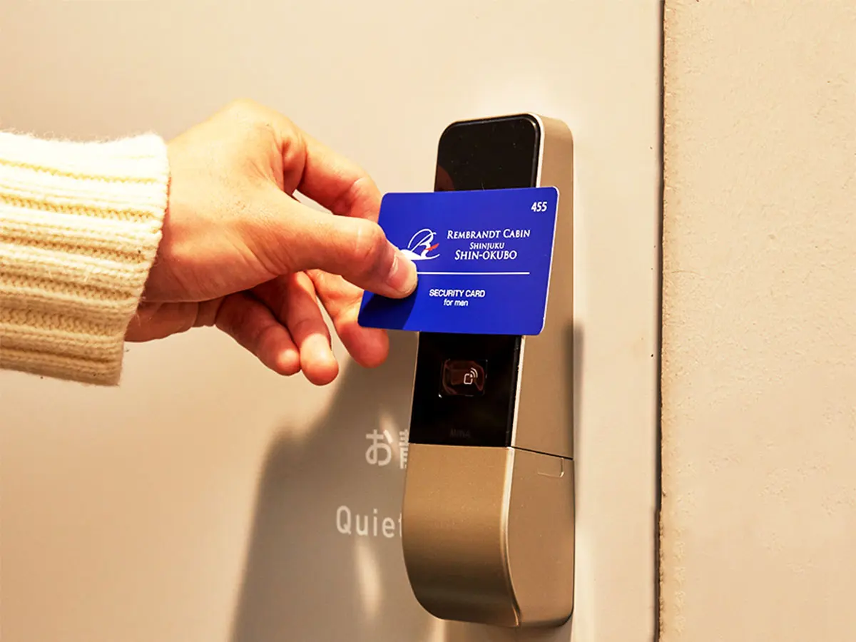 男女の宿泊フロア入口のスマートロックシステムにより安心で安全性の高いセキュリティを確保。カプセルにはご宿泊・仮眠利用のお客様のみが入退室可能となっており、男女それぞれのフロアへの入退出も制限されております。